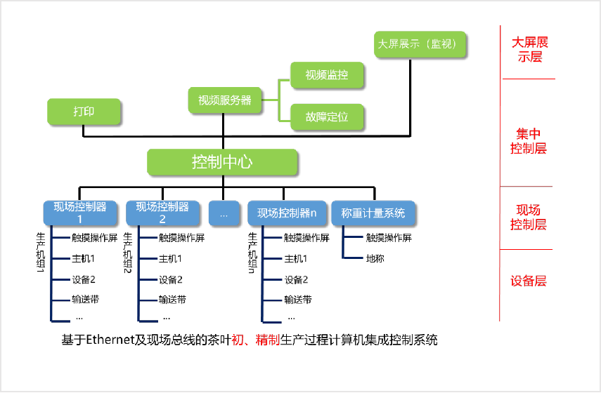 控制系統(tǒng)采用網(wǎng)絡(luò)技術(shù)及現(xiàn)場總線技術(shù),分為大屏展示(監(jiān)視)層、集中控制層、現(xiàn)場控制層和設(shè)備層共四級。系統(tǒng)通過網(wǎng)絡(luò),將現(xiàn)場控制單元進(jìn)行互聯(lián),將所有數(shù)據(jù)集中到總控計(jì)算機(jī)上,從而形成對整條生產(chǎn)線的控制以及生產(chǎn)參數(shù)與報(bào)表的匯總,并把相關(guān)的展示信息和畫面監(jiān)控信息投送大屏展示層,具備傳輸信號容量大、實(shí)時性強(qiáng)的特點(diǎn)。